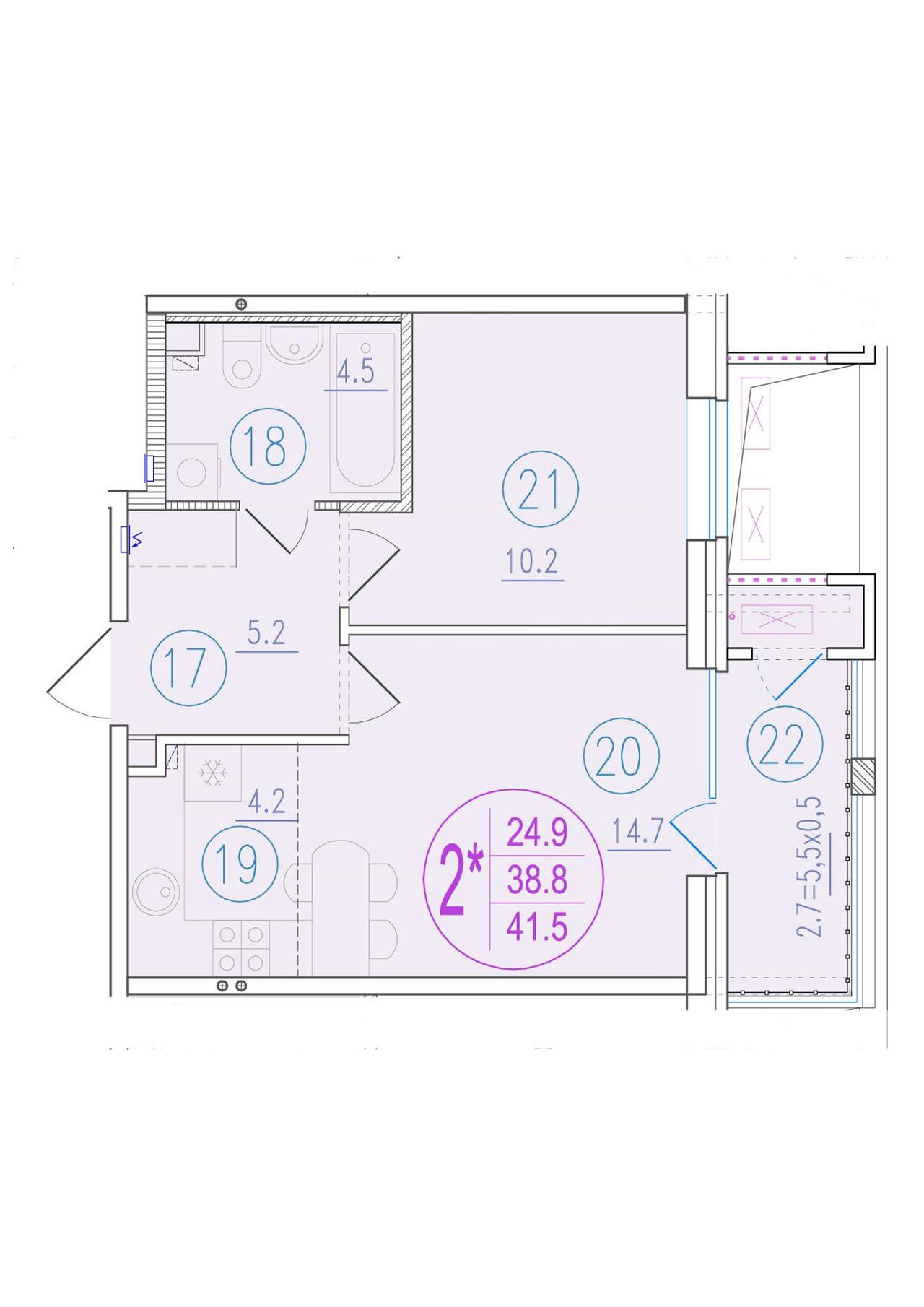2-комнатная — 41,5 м² 2/23 эт. в Состояние