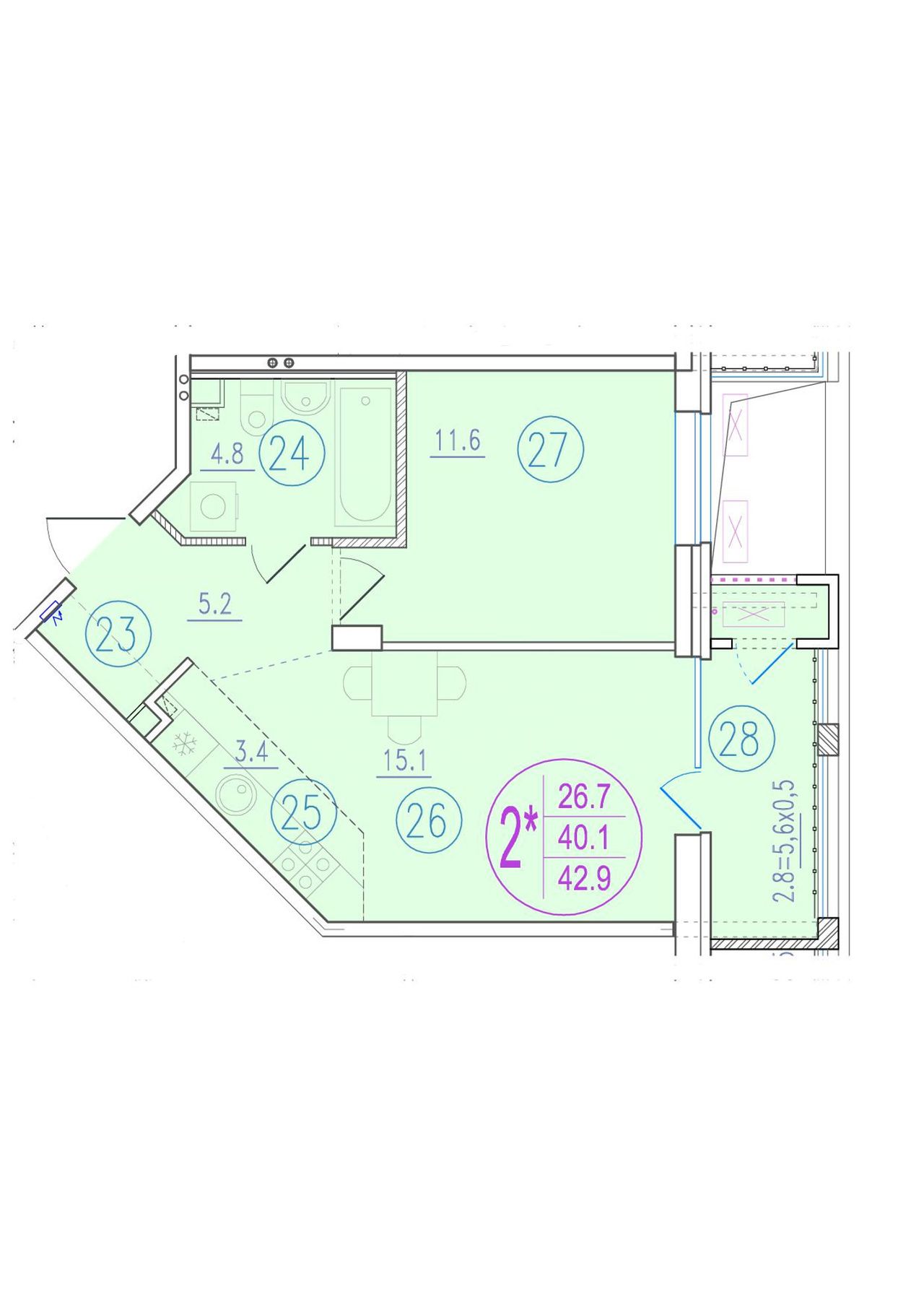 2-комнатная — 42,9 м² 2/23 эт. в Состояние