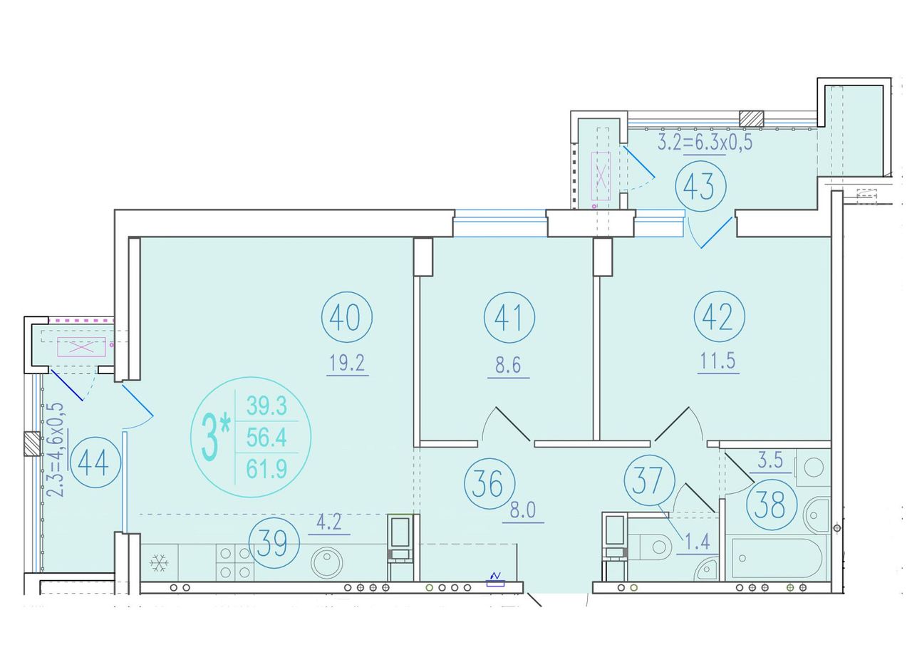3-комнатная — 61,9 м² 5/23 эт. в Состояние
