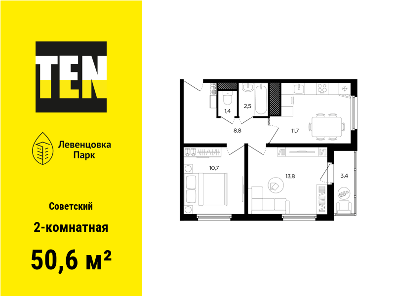 2-комнатная — 50,6 м² 25/25 эт. в Левенцовка Парк