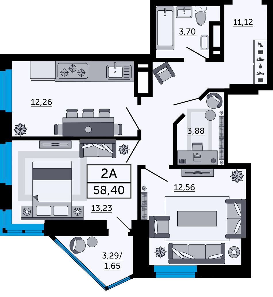 2-комнатная — 58,4 м² 2/25 эт. в Royal Towers (Роял Тауэрс)