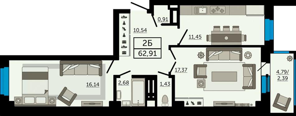 2-комнатная — 62,91 м² 15/25 эт. в Four Premiers (Фор Премьерс)