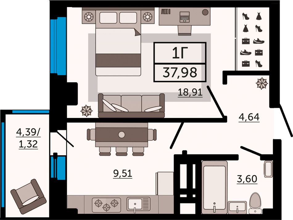1-комнатная — 37,98 м² 21/25 эт. в Four Premiers (Фор Премьерс)