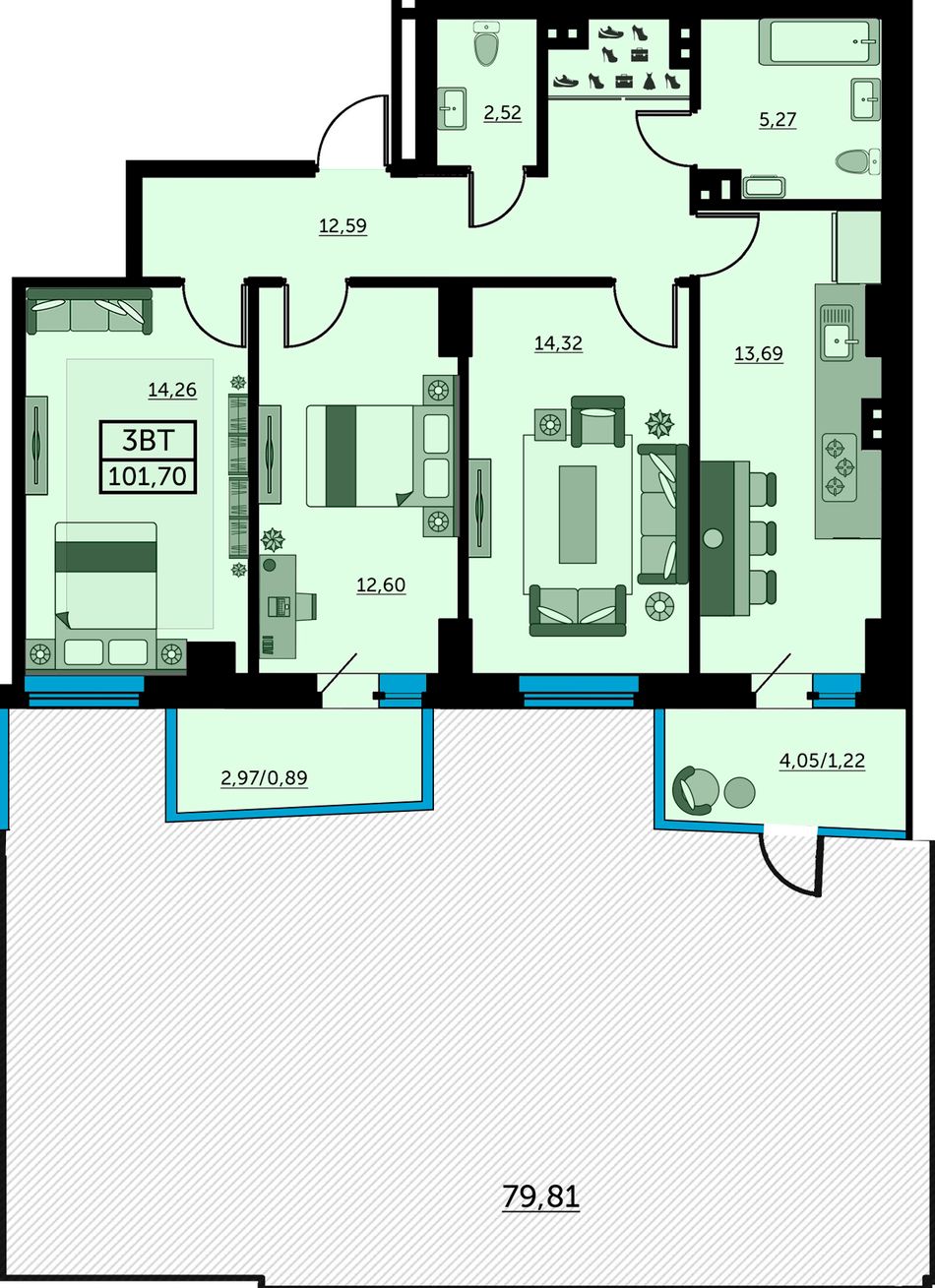 3-комнатная — 101,7 м² 2/25 эт. в Сердце Ростова 2