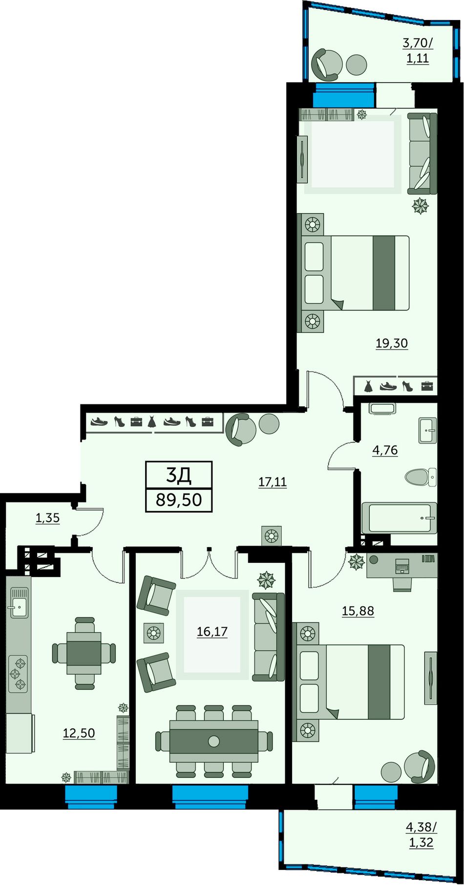 3-комнатная — 88,97 м² 11/13 эт. в Сердце Ростова 2