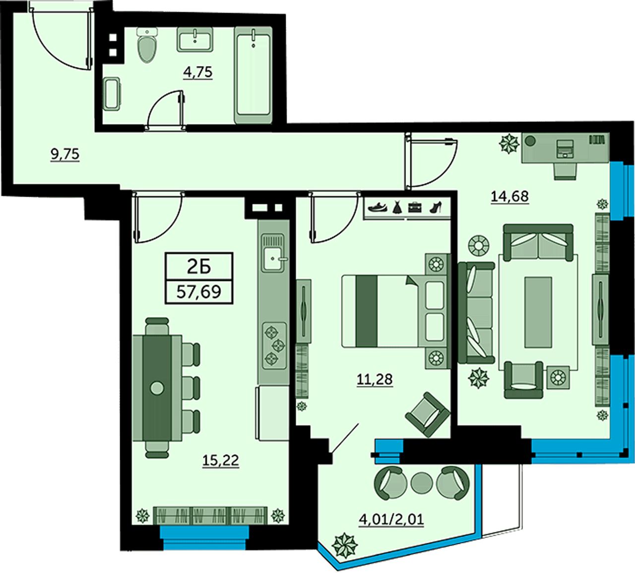 2-комнатная — 57,51 м² 23/25 эт. в Сердце Ростова 2