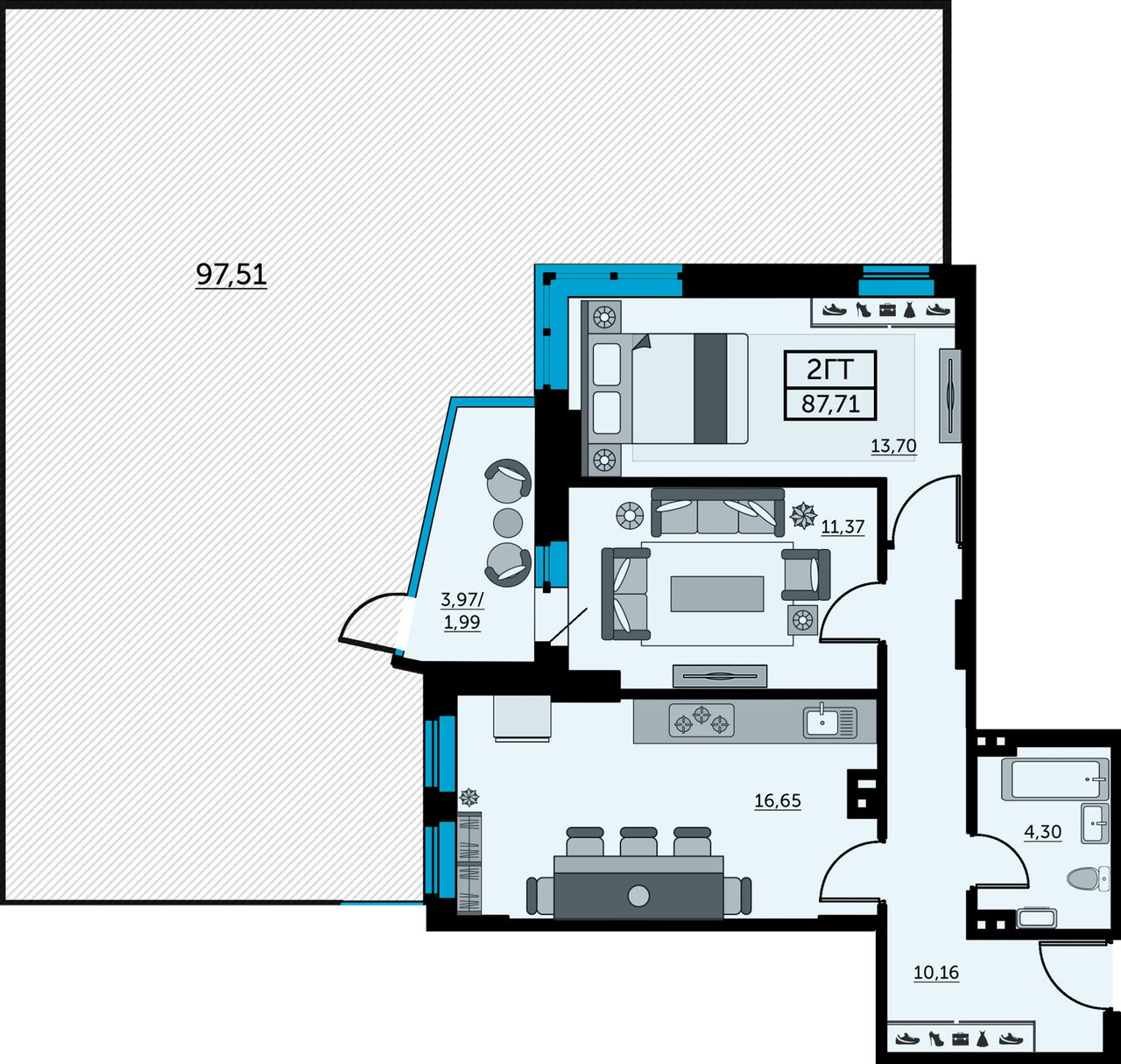 2-комнатная — 88,1 м² 2/25 эт. в Сердце Ростова 2