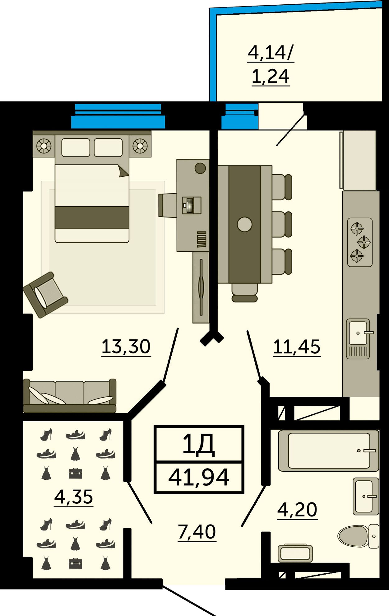 1-комнатная — 41,8 м² 21/26 эт. в Город у реки