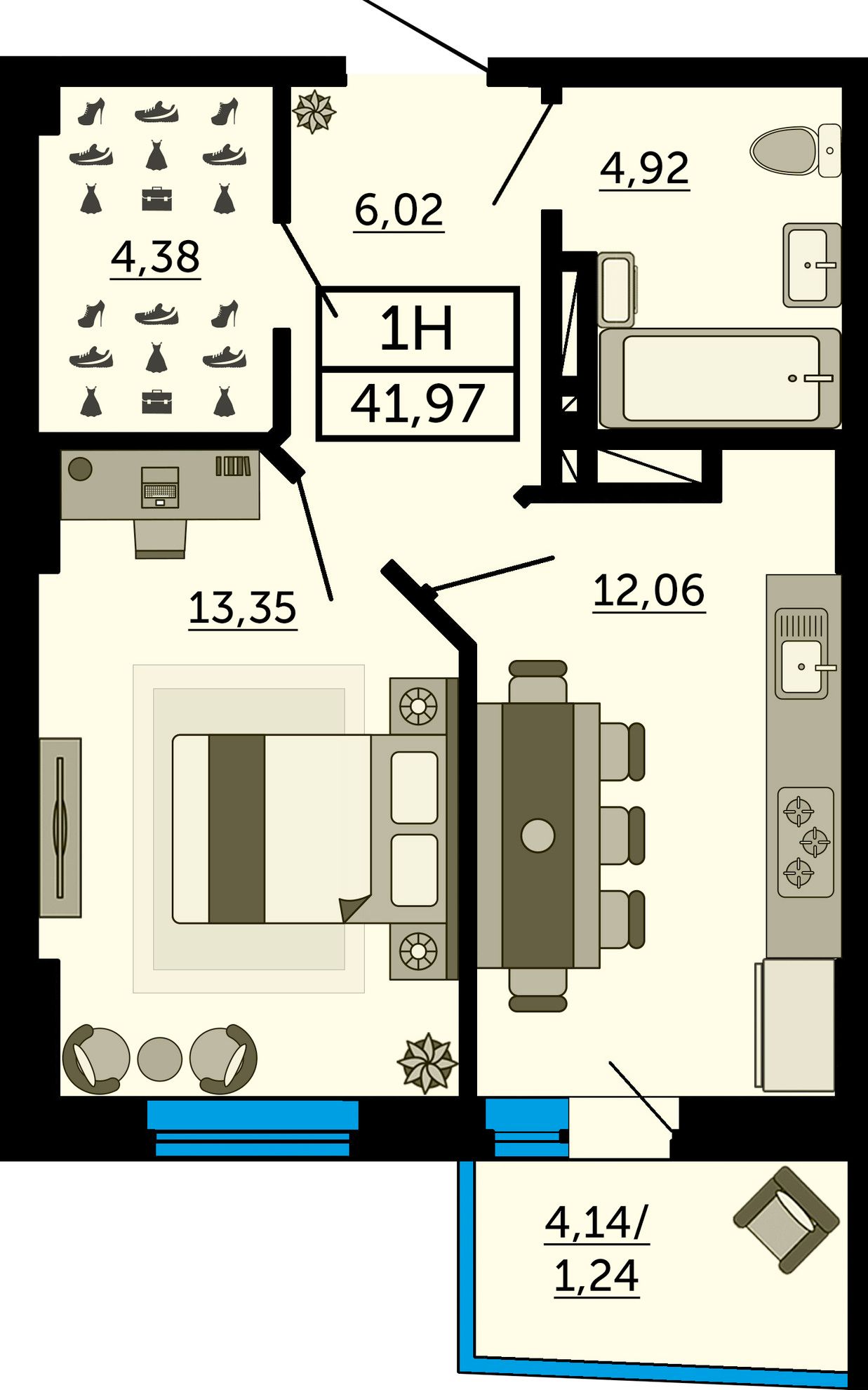 1-комнатная — 41,6 м² 25/26 эт. в Город у реки