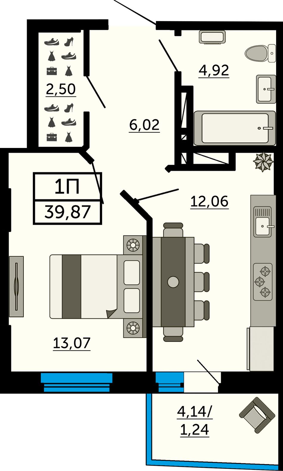 В продаже однокомнатная квартира в новостройке. Лучшее решение для молодой семьи, под сдачу или для инвестиций. В однокомнатной квартире есть, всё необходимое для комфортной жизни: просторная прихожая, светлая комната и гардеробная. Это функциональный лот, который подойдет на самый взыскательный вкус. Успейте забронировать квартиру напрямую от застройщика.