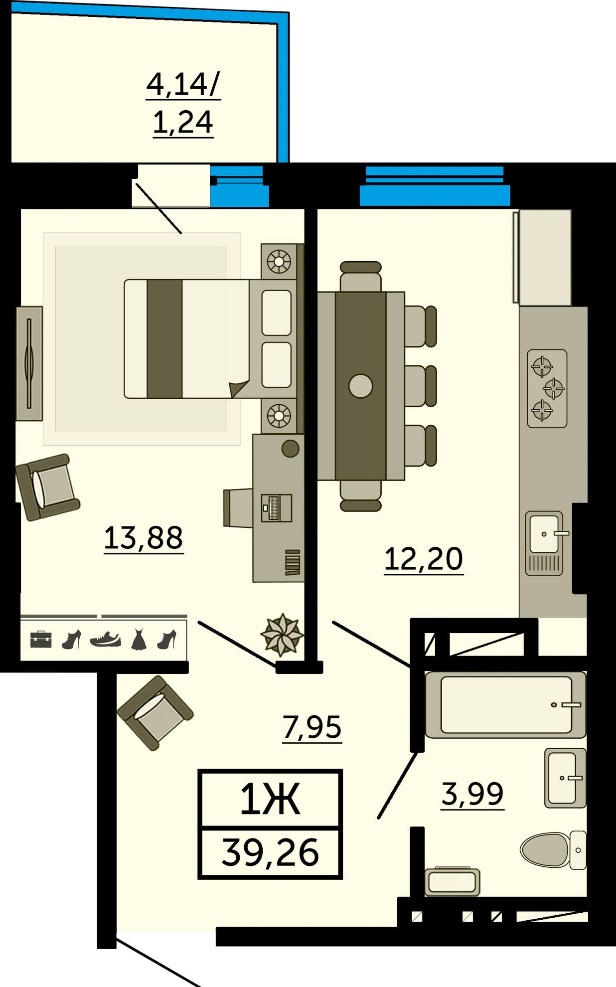 1-комнатная — 39,3 м² 18/26 эт. в Город у реки