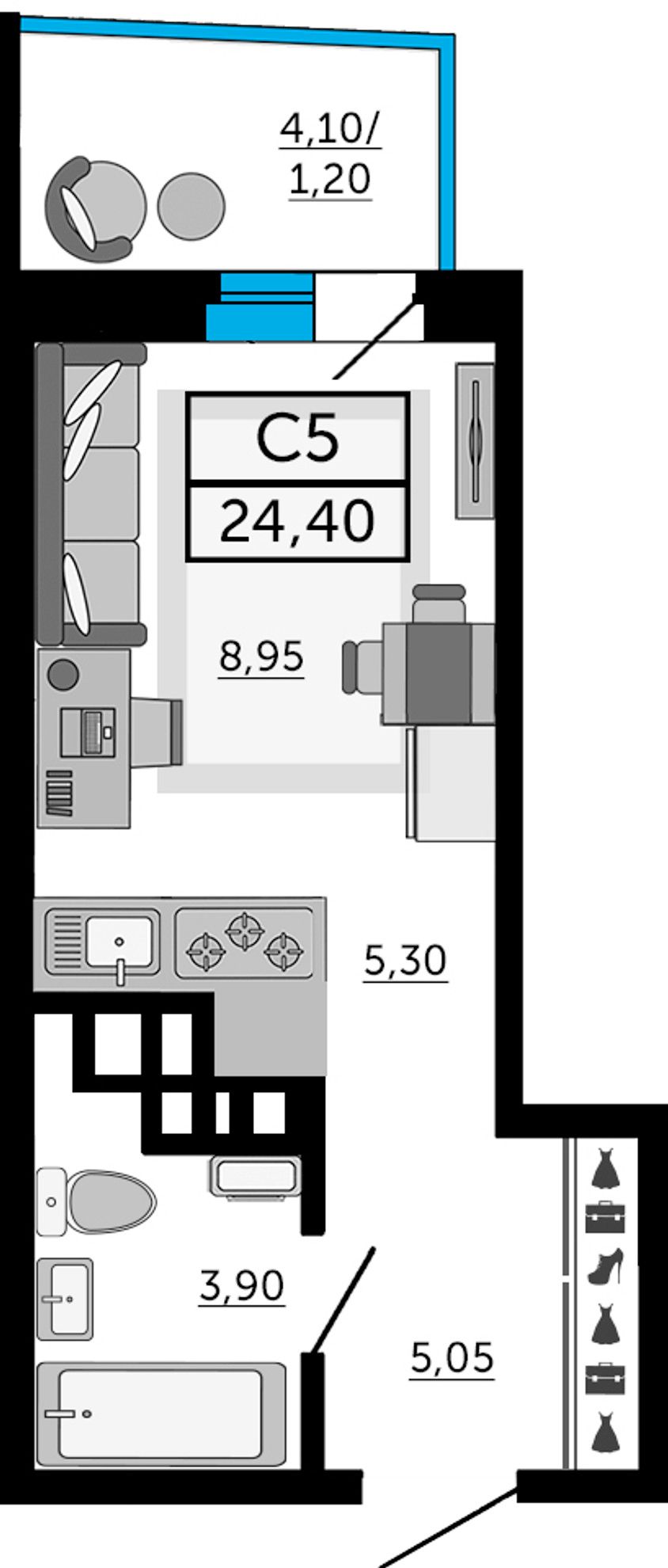 | Студия | 24 - 29 м² | 3,7 - 5 млн ₽ |