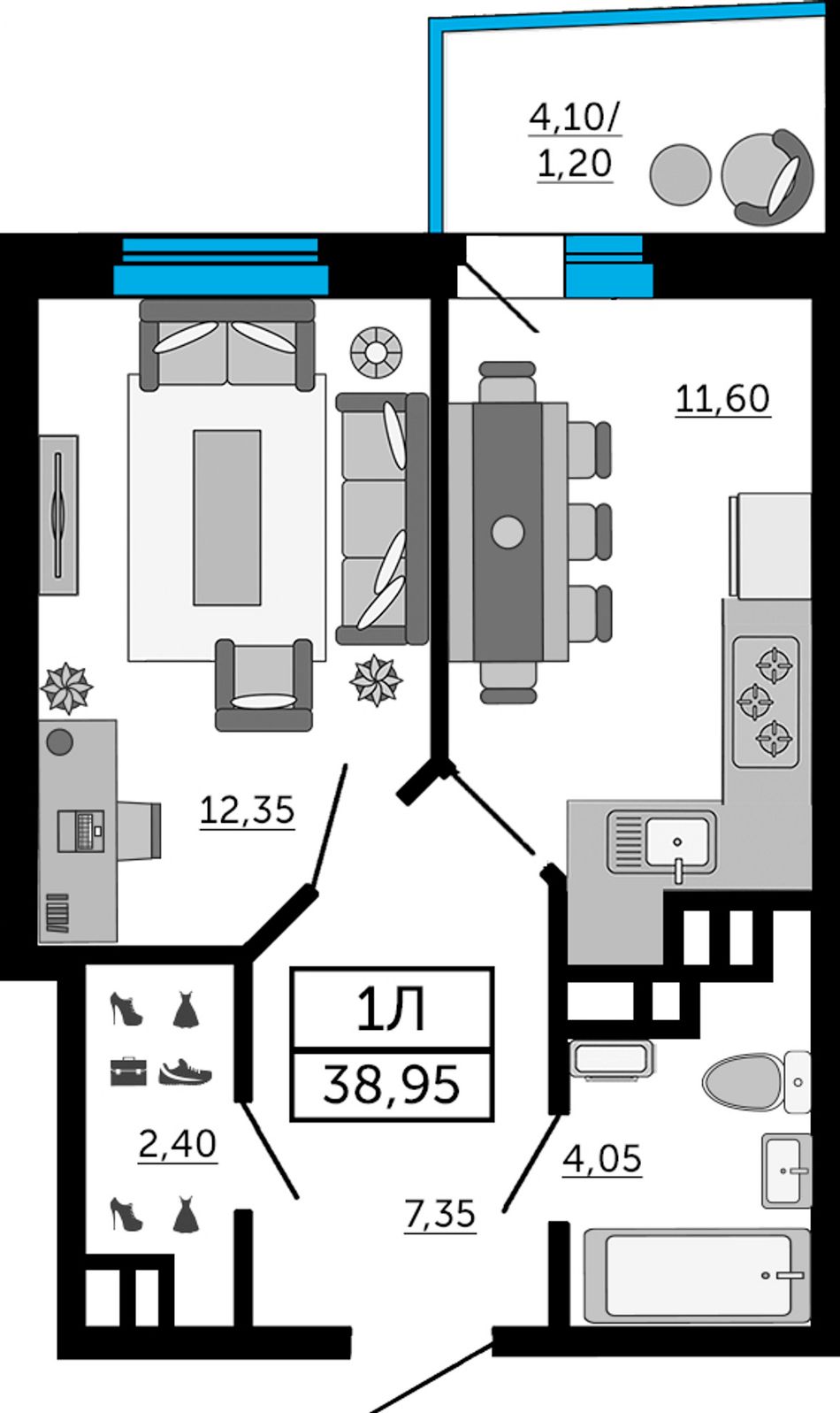 Общая площадь38,95 м²