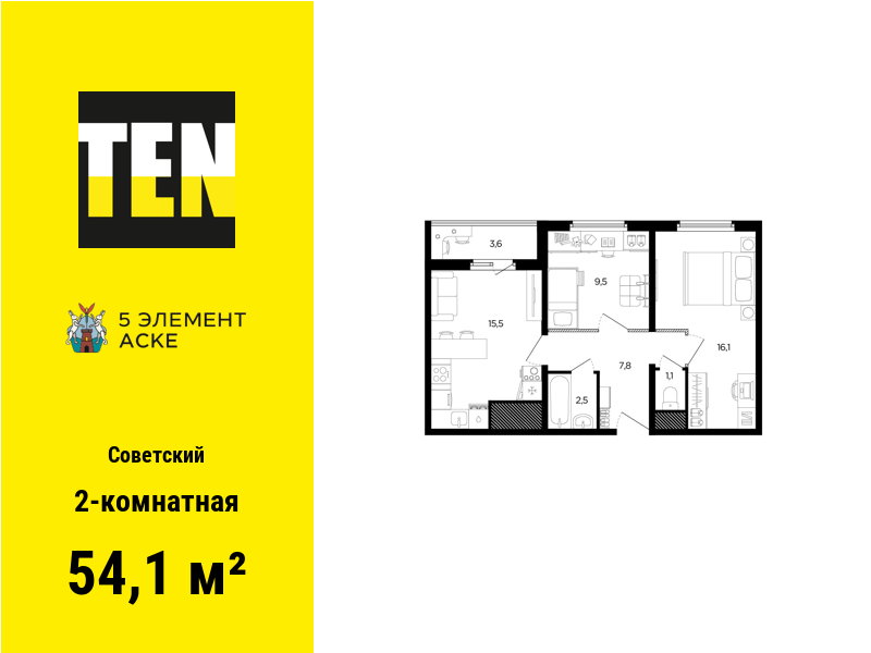 2-комнатная — 54,1 м² 4/17 эт. в 5 элемент Аске