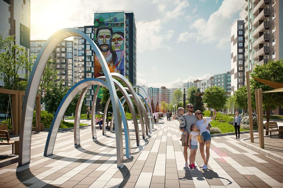 Яркие фасады, закрытый двор, два детских садика, школа, благоустроенные зоны отдыха с бесплатным Wi-Fi на всей территории.