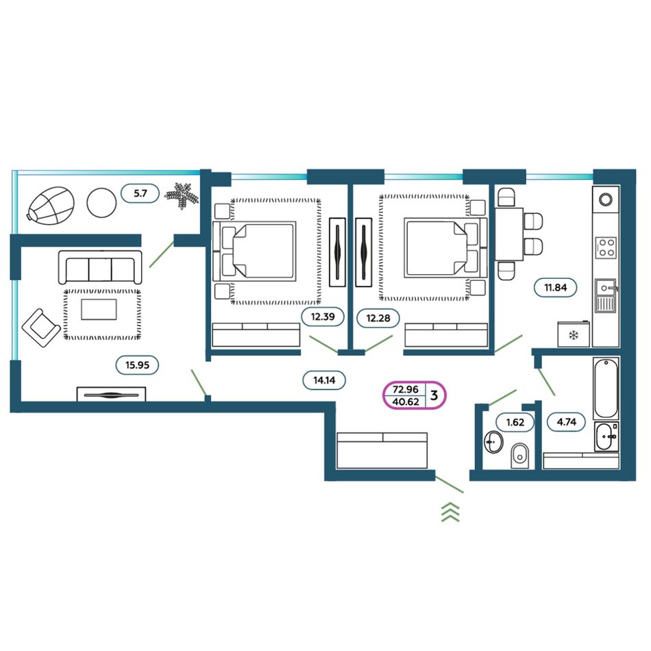 3-комнатная — 77,6 м² 1/8 эт. в Пульс