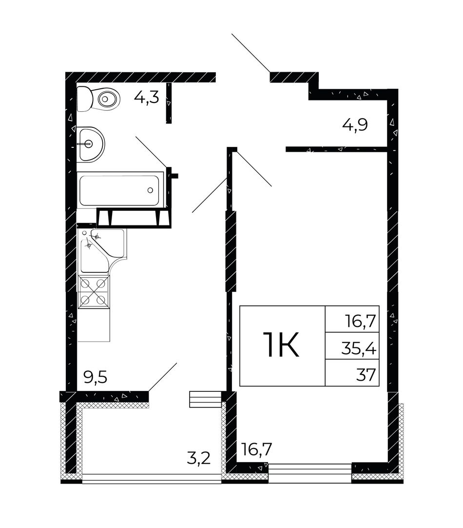 1-комнатная — 37,2 м² 2/15 эт. в Флора