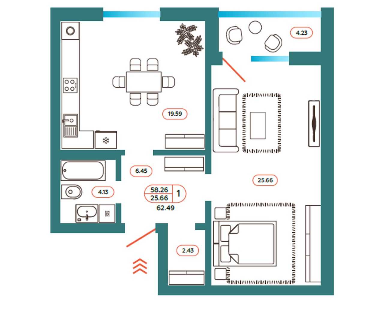 1-комнатная — 62,5 м² 1/9 эт. в Пульс