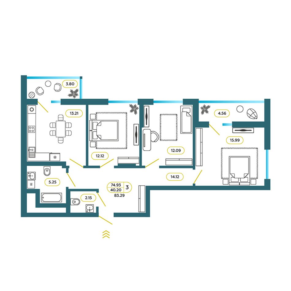 3-комнатная — 83,7 м² 1/10 эт. в Пульс