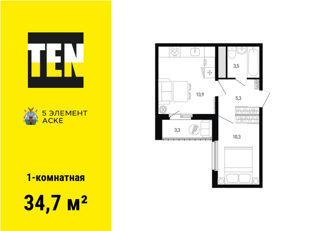 1-комнатная — 34,7 м² 7/16 эт. в 5 элемент Аске