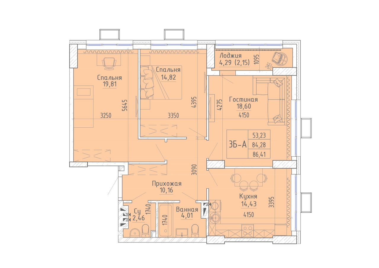 3-комнатная — 86,41 м² 2/20 эт. в Орион