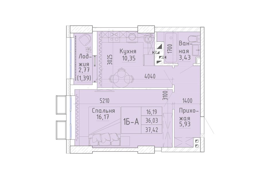 1-комнатная — 37,42 м² 2/20 эт. в Орион