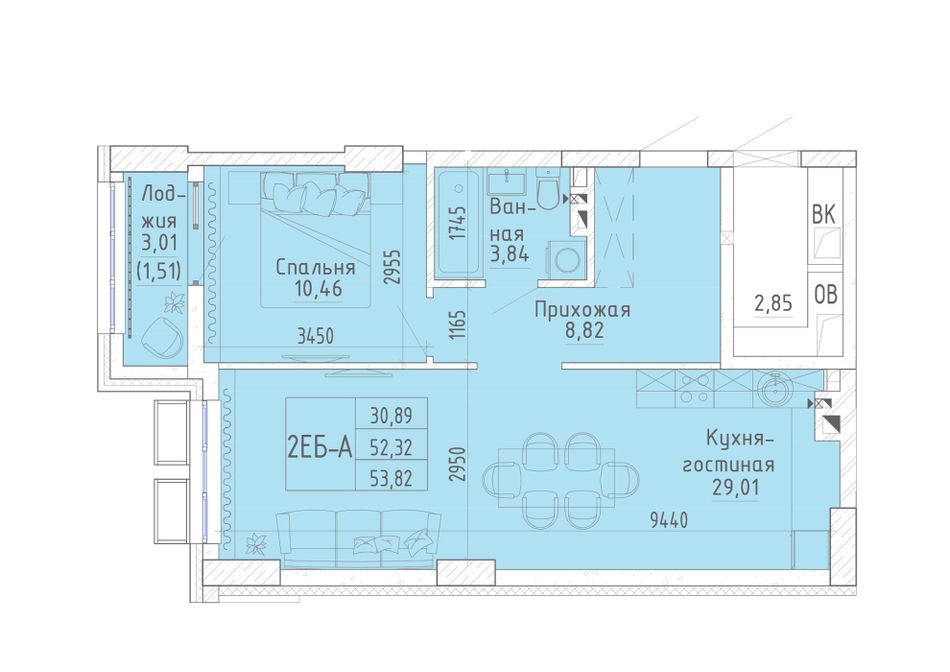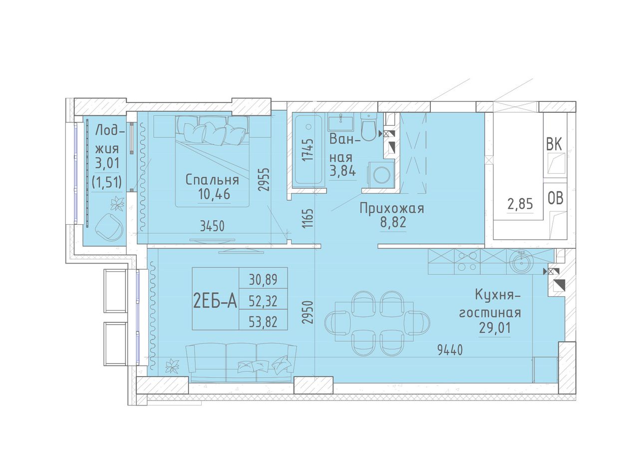 Общая площадь53,65 м²