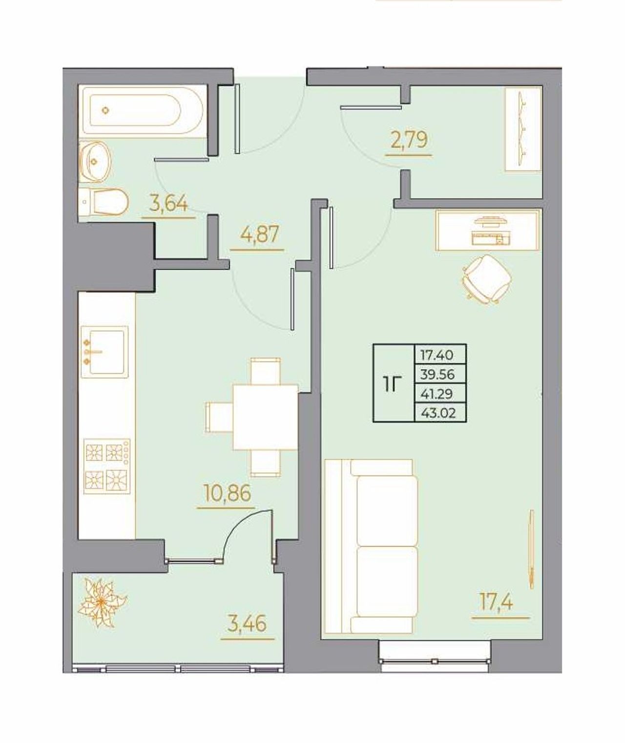 Общая площадь43,02 м²