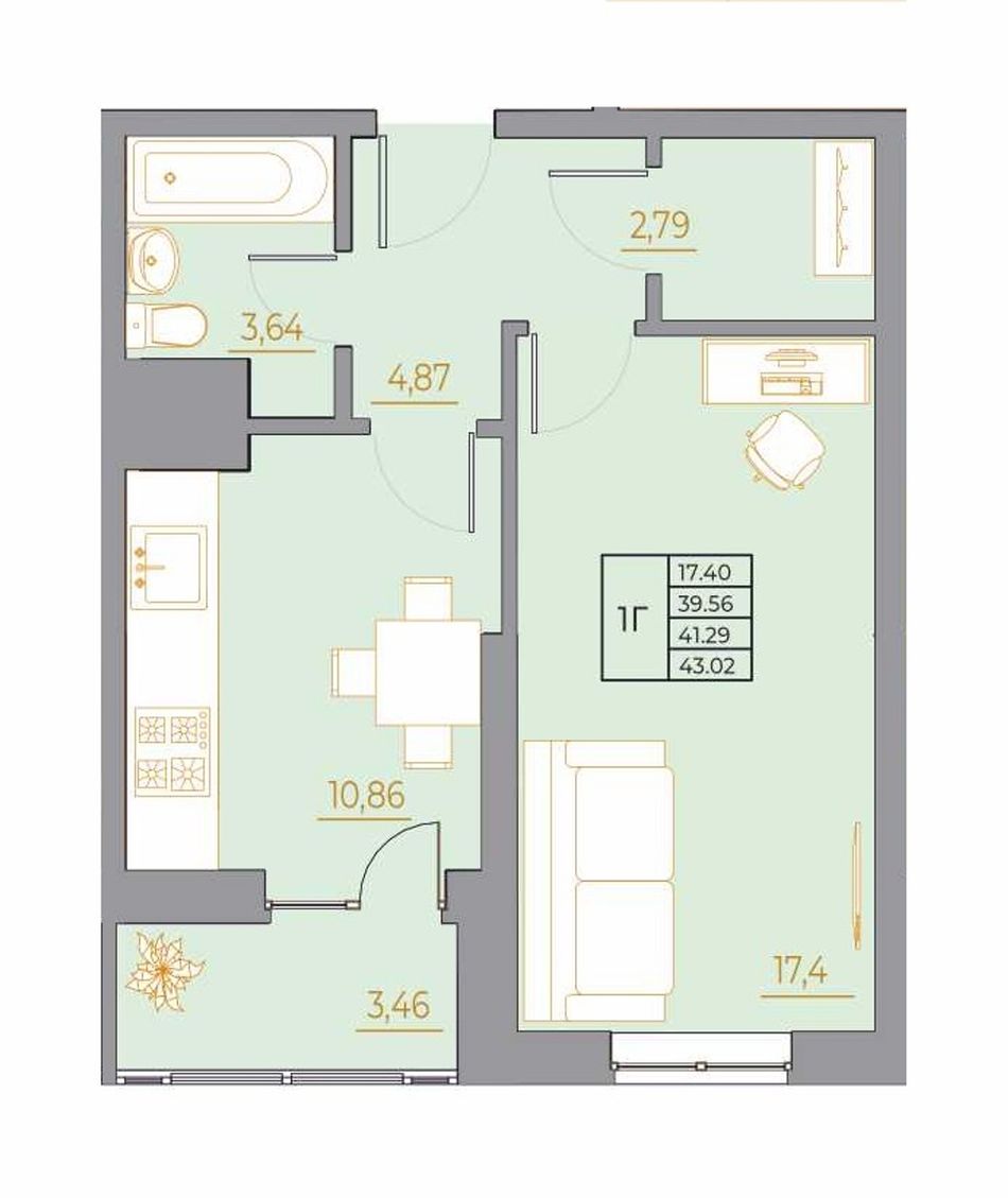 1-комнатная — 43,02 м² 14/22 эт. в Новый горизонт