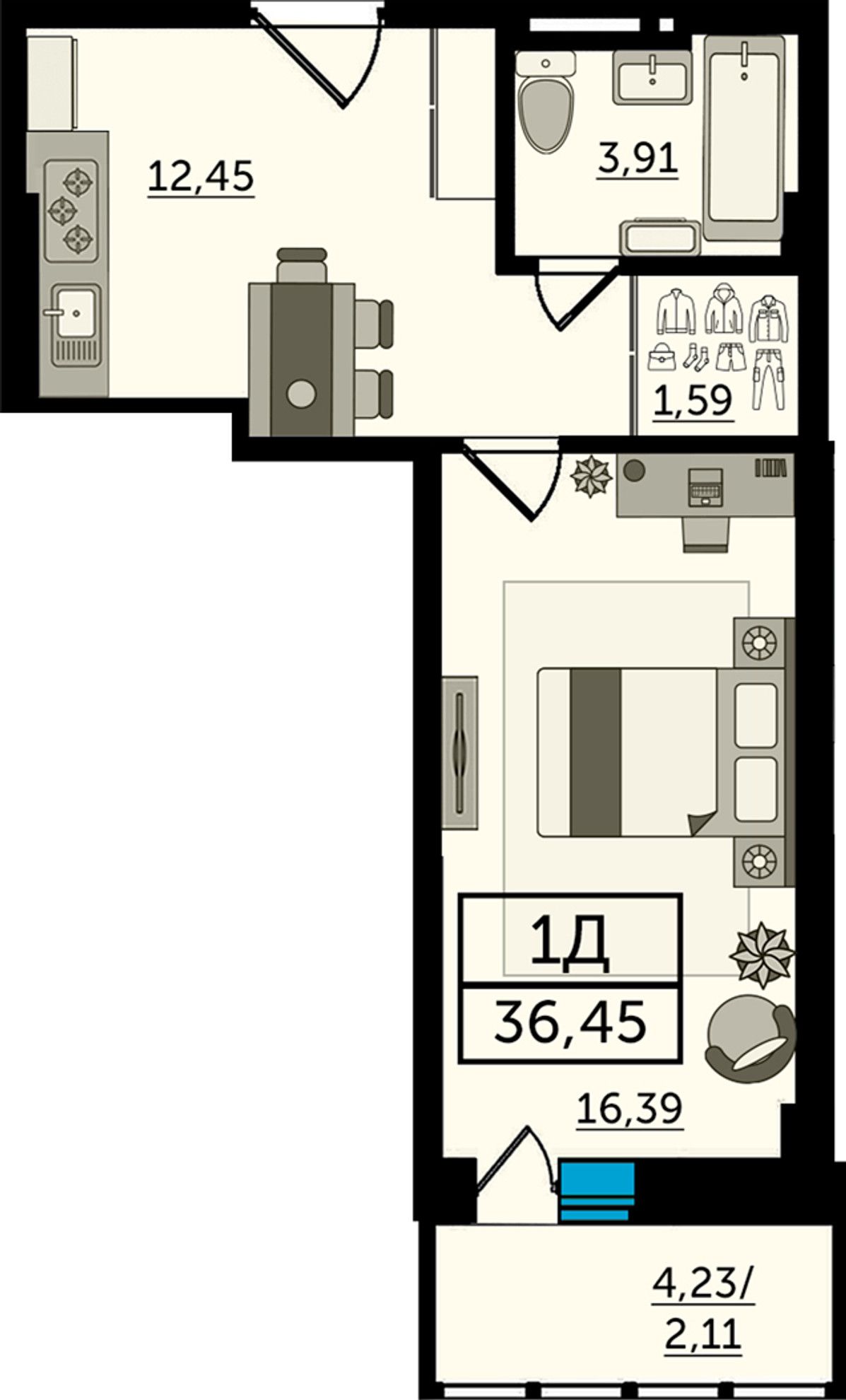 1-комнатная — 36,42 м² 6/25 эт. в Кристалл-2