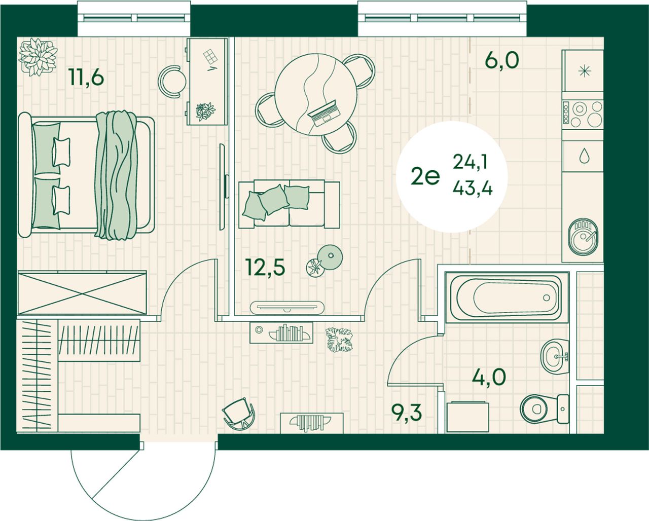 2-комнатная — 43,4 м² 6/17 эт. в Green Apple