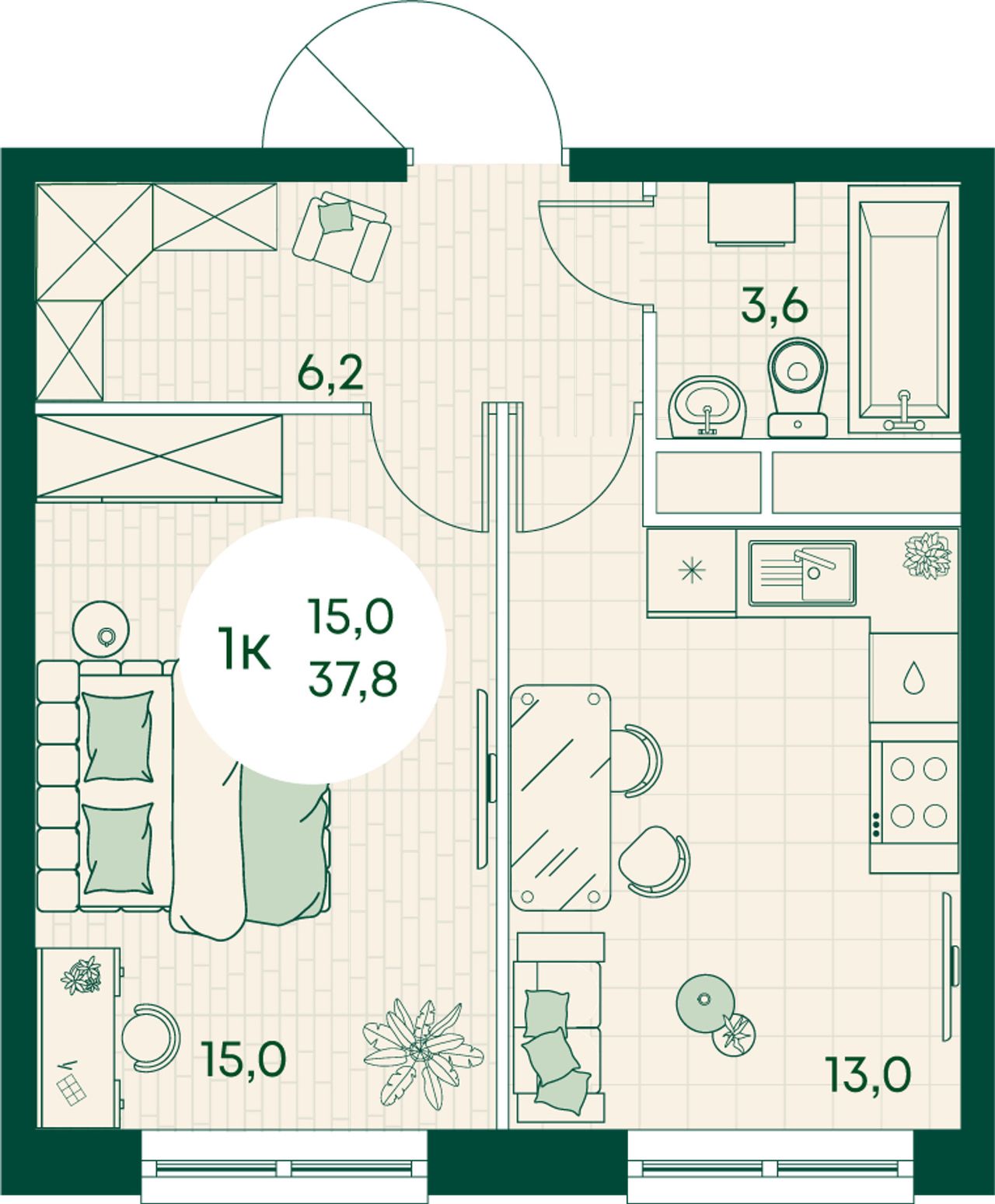 1-комнатная — 37,8 м² 4/17 эт. в Green Apple