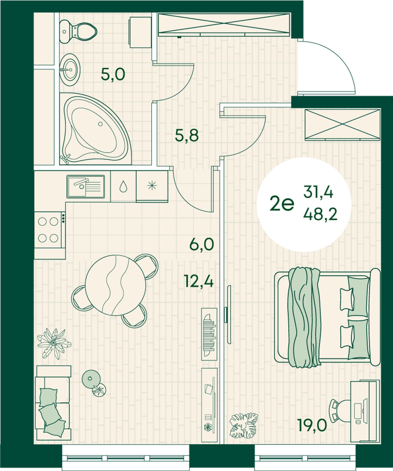 2-комнатная — 48,2 м² 6/17 эт. в Green Apple