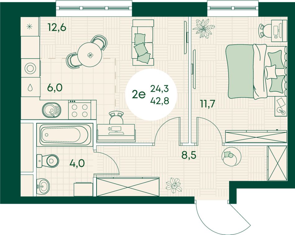 2-комнатная — 42,8 м² 9/17 эт. в Green Apple