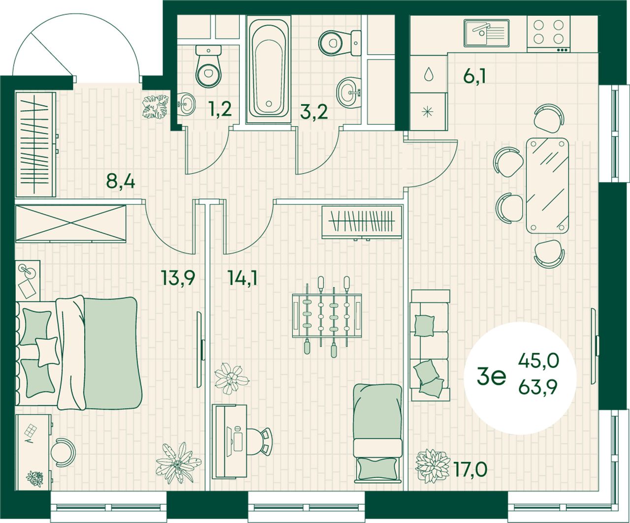 3-комнатная — 63,9 м² 13/17 эт. в Green Apple