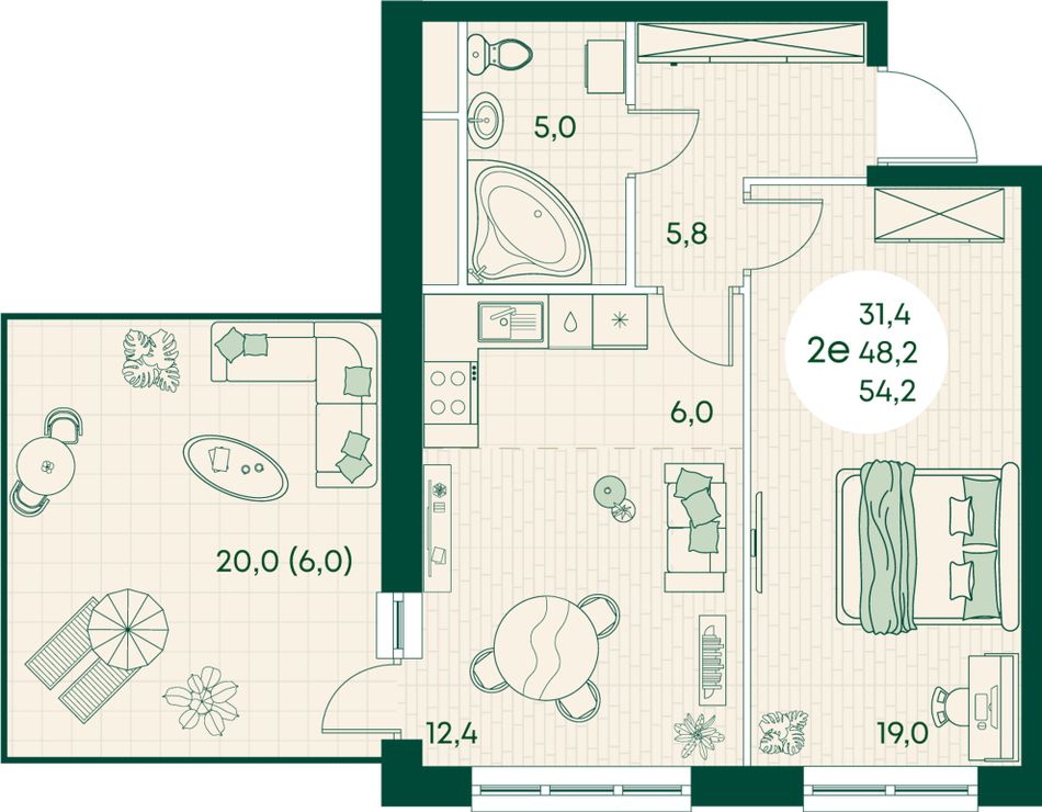2-комнатная — 54,2 м² 15/17 эт. в Green Apple