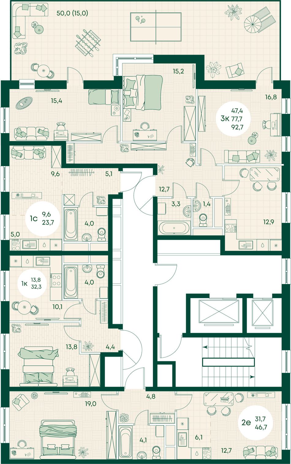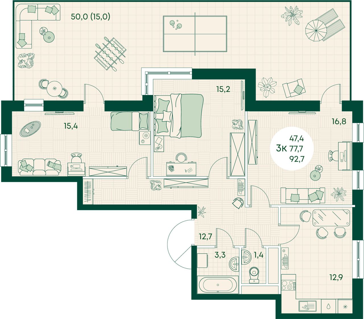 3-комнатная — 92,7 м² 2/17 эт. в Green Apple