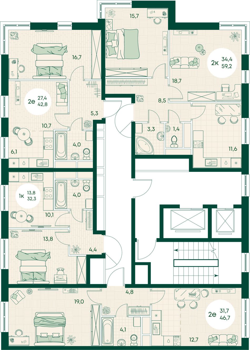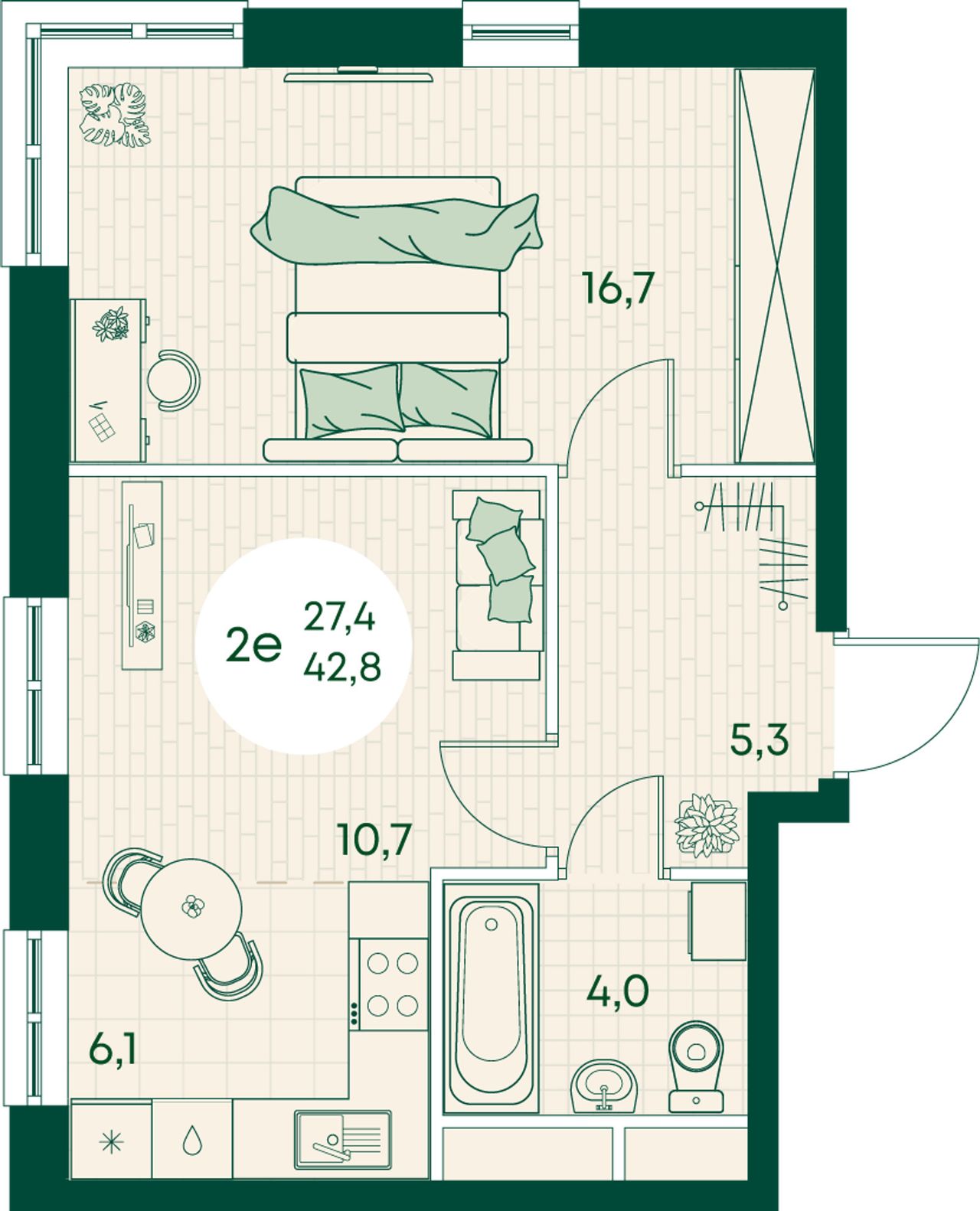 2-комнатная — 42,8 м² 15/17 эт. в Green Apple