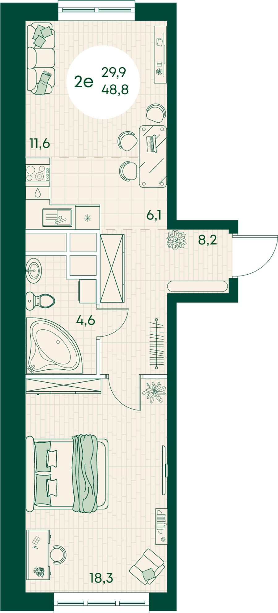 2-комнатная — 48,8 м² 11/17 эт. в Green Apple