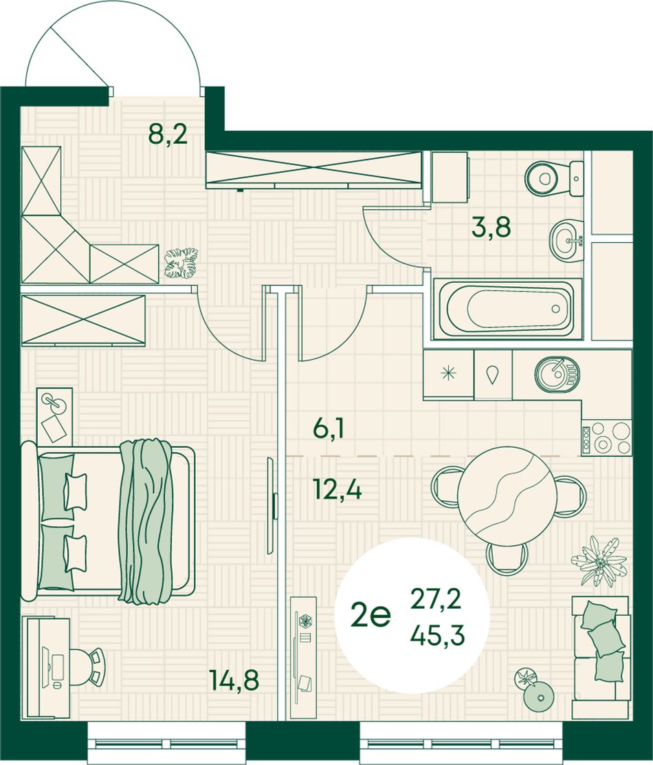 2-комнатная — 45,3 м² 12/17 эт. в Green Apple