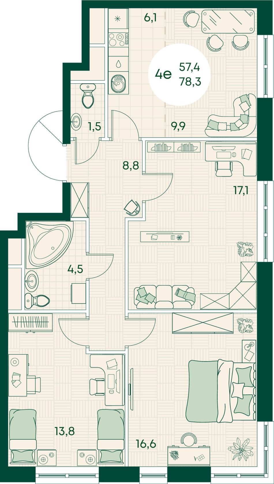 4+ комнатная — 78,3 м² 15/17 эт. в Green Apple
