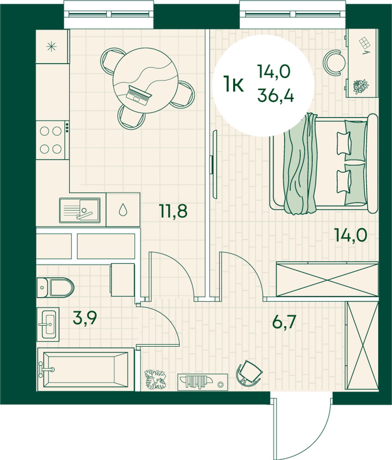1-комнатная — 36,4 м² 3/17 эт. в Green Apple