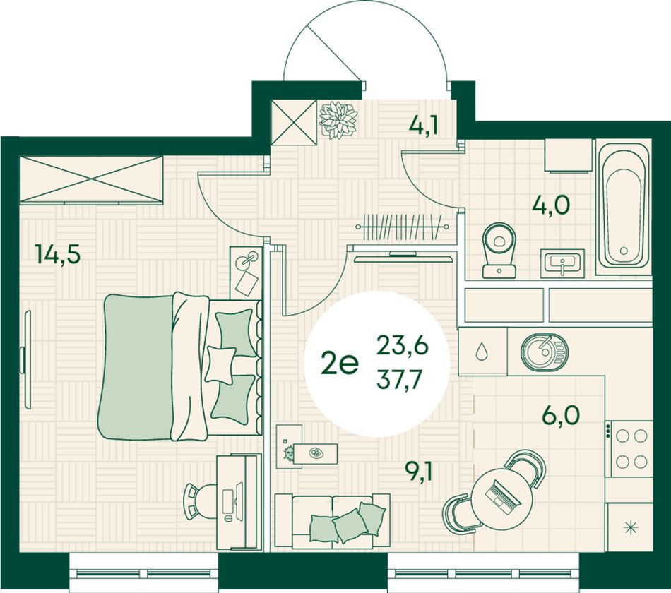 2-комнатная — 37,7 м² 6/17 эт. в Green Apple