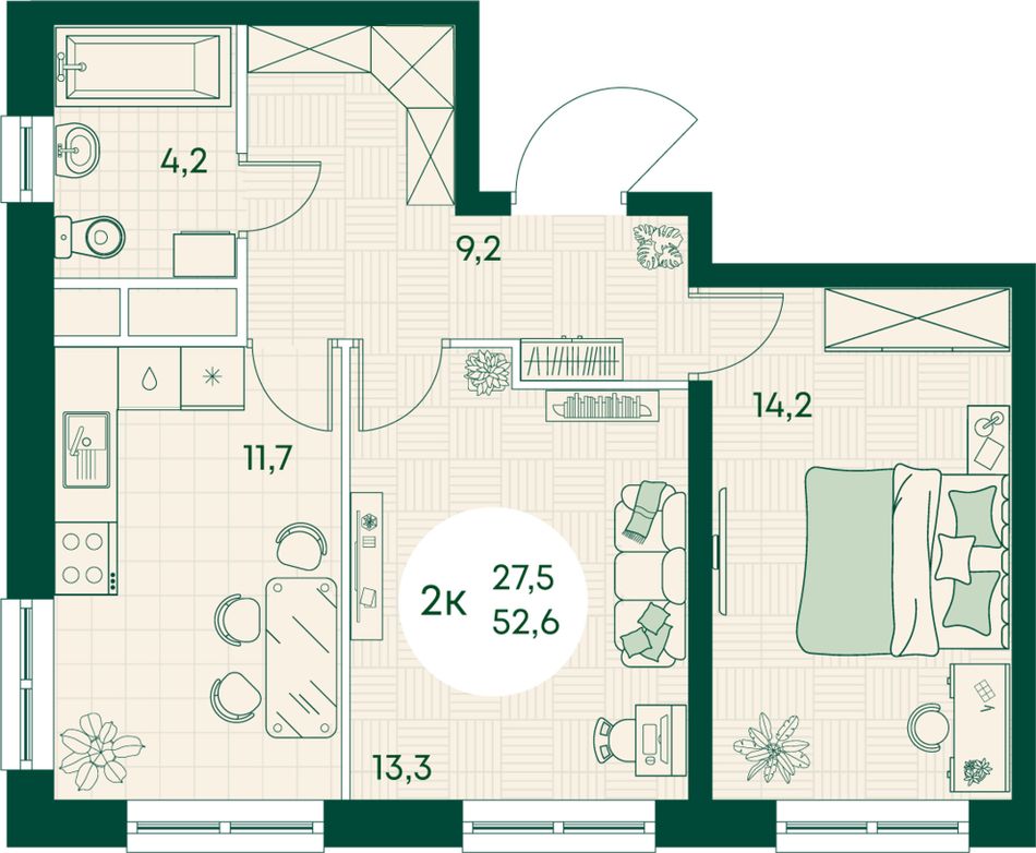 2-комнатная — 52,6 м² 15/17 эт. в Green Apple