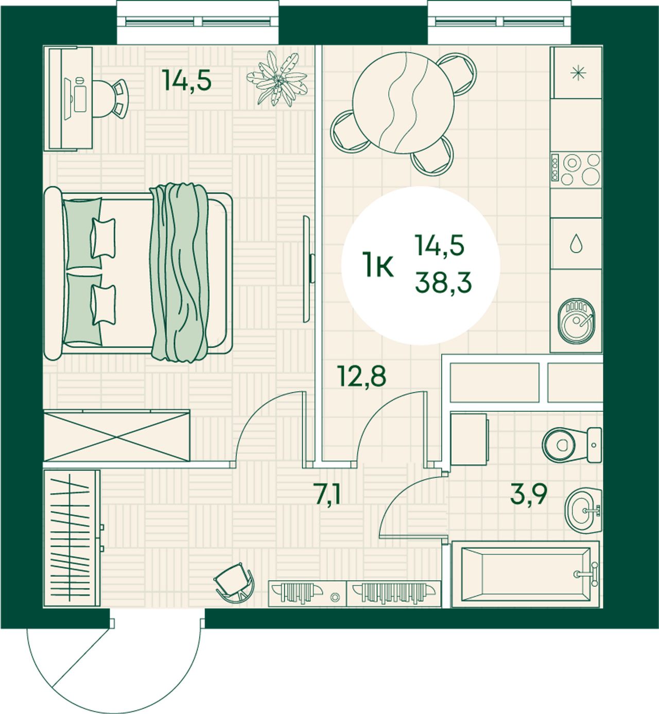 1-комнатная — 38,3 м² 5/17 эт. в Green Apple