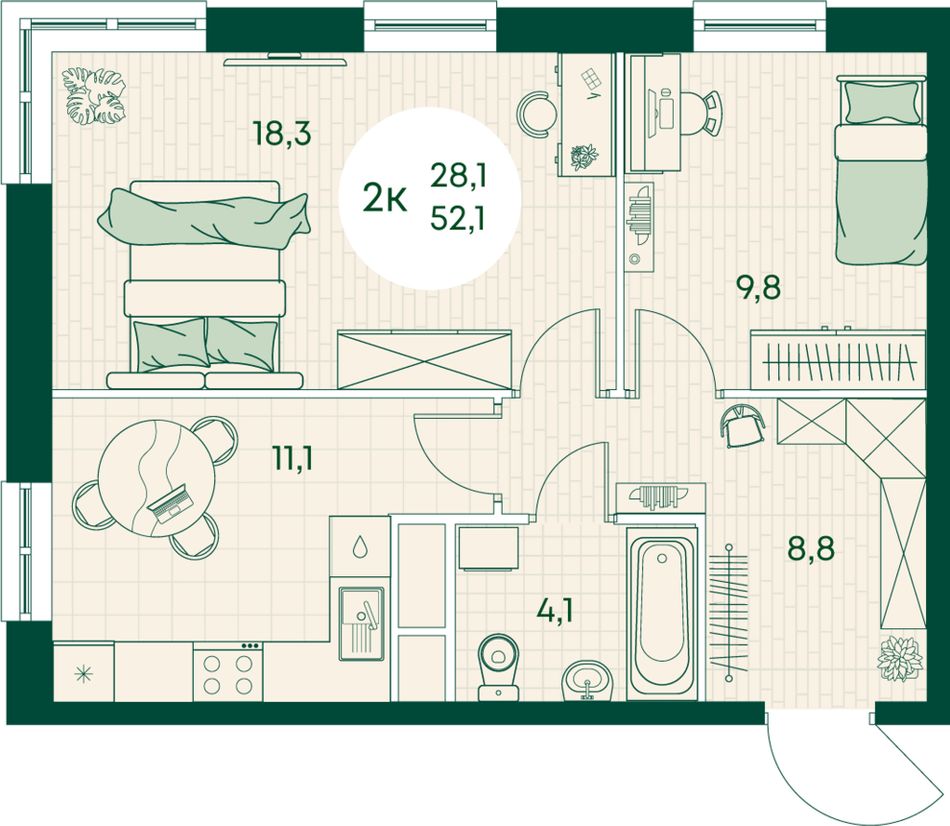 2-комнатная — 52,1 м² 8/17 эт. в Green Apple