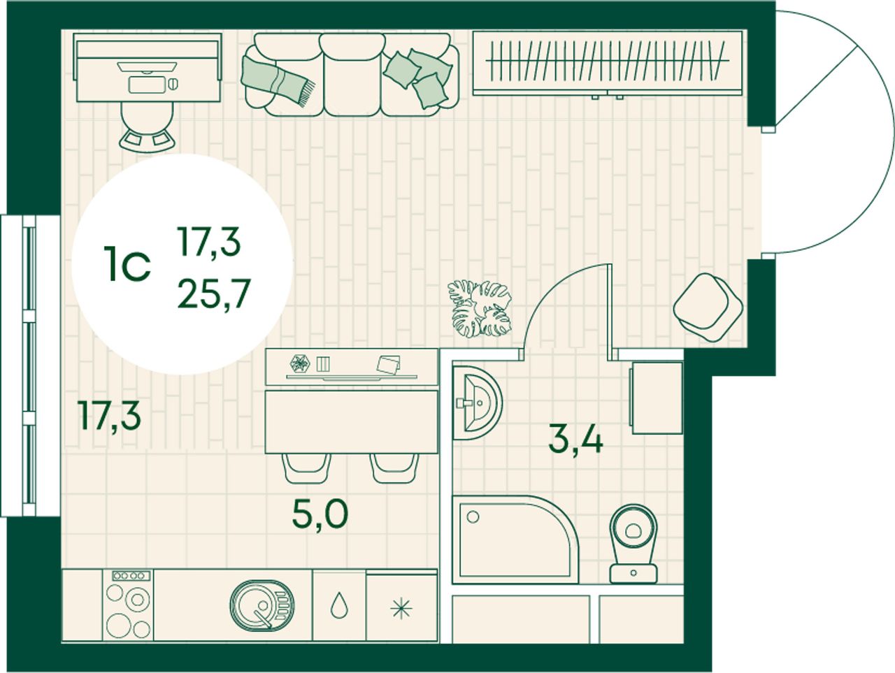 Студия — 25,7 м² 3/17 эт. в Green Apple