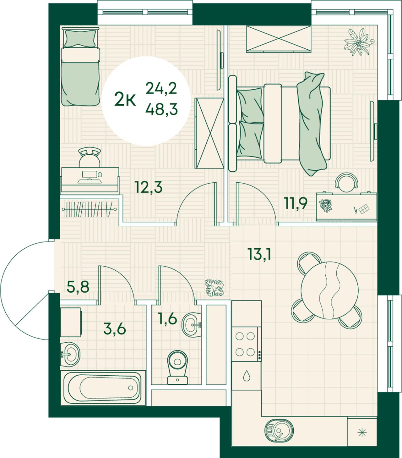 2-комнатная — 48,3 м² 14/17 эт. в Green Apple