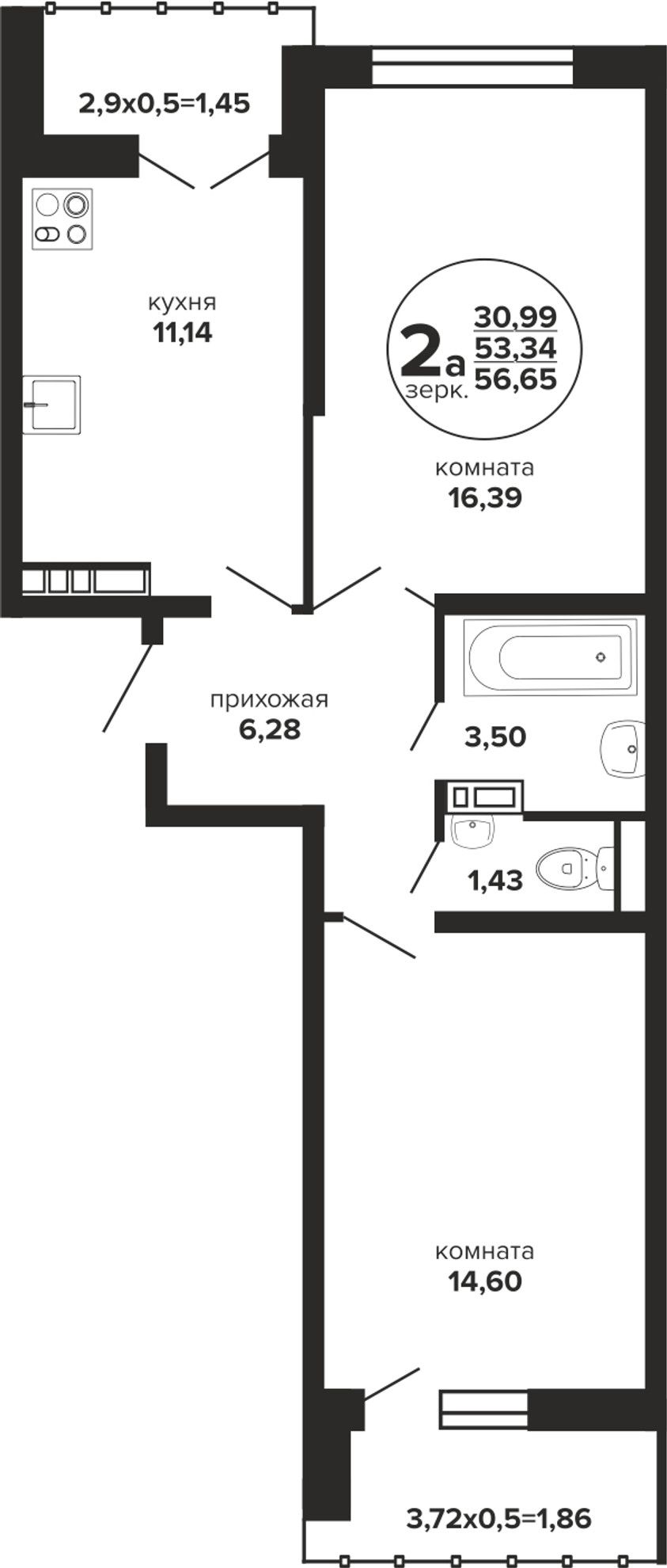 2-комнатная — 57,55 м² 22/24 эт. в Гулливер