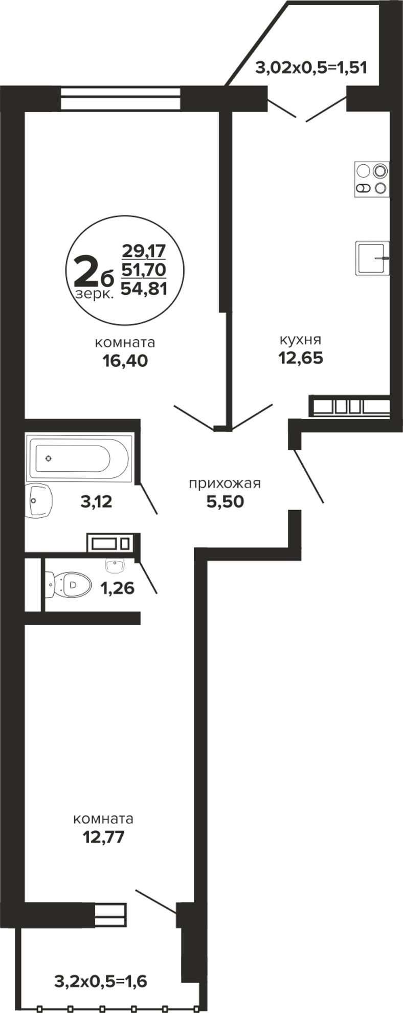 2-комнатная — 55,75 м² 23/24 эт. в Гулливер